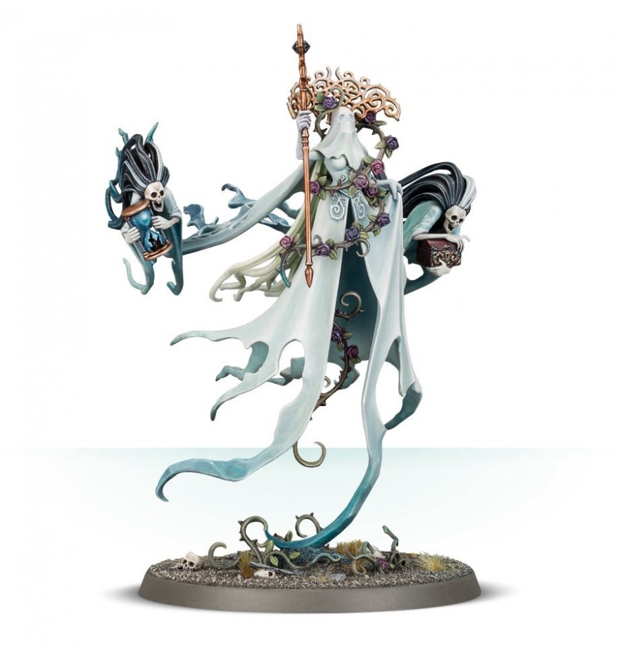 Este kit de plástico de varias partes contiene los componentes necesarios para ensamblar Lady Olynder, Mortarch of Grief. Como Mortarch of Grief, está rodeada de un aura de miseria absoluta: esta miniatura hace un trabajo impresionante al capturar la desolación. Flotando sobre el suelo con su horrible vestido de novia y velo, en realidad se ve muy poco de su forma que no sea el contorno de una calavera. Su tren nupcial, arruinado y destrozado, fluye detrás de ella, con un mechón de esta prenda etérea que une la miniatura a su base. Enredaderas espinosas de rosas sepulcrales, que brotan donde ella flota, se envuelven alrededor de su cintura y hasta su tocado, que en sí mismo se asemeja a un brezo espinoso. En su mano derecha empuña el Bastón de la Medianoche, un bastón adornado con una piedra preciosa pulida de arena vitrificada. Ella está acompañada por 2 macabras Banshee Handmaidens, espeluznantes espectros con cara de calavera. Cada uno lleva un regalo: un reloj de arena de arena sepulcral entregado por el propio Nagash que puede romperse en pedazos con un efecto letal, y un ataúd sellado, cuyo contenido es un misterio; es poco probable que sea algo positivo ...