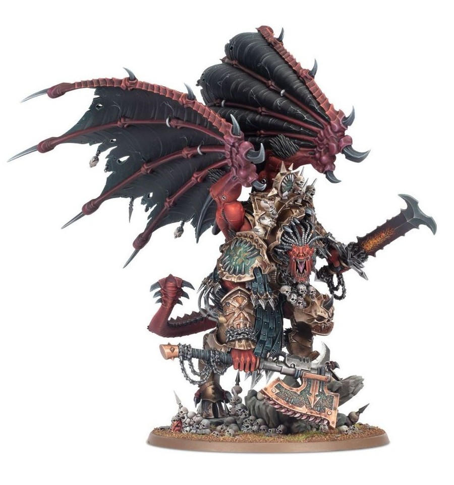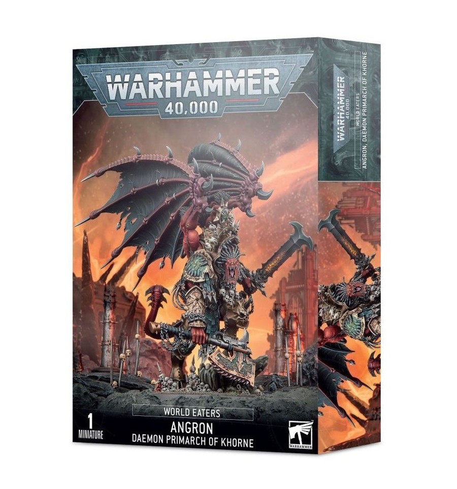 Este kit multicomponente permite construir a Angron, Primarca Demonio de Khorne, el eterno señor de la Legión de los Devoradores de Mundos. Este imponente guerrero sobresale por encima de la mayoría de las miniaturas en el campo de batalla, incluyendo a sus propios frenéticos hijos entre los Devoradores de Mundos. Está armado con su enorme hacha sierra, Spinegrinder, y la brutal espada demoníaca con runas grabadas, conocida como Samni'arius; ambas armas encadenadas a sus muñecas al más puro estilo nuceriano. Su forma deformada está adornada con espeluznantes trofeos e iconografía de los Devoradores de Mundos, con una cola de garrote con púas que se agita tras él, ensombrecida por un par de siniestras alas con pinchos. Incluso su base está llena de calaveras, mientras sus pies con pezuñas ascienden por un afloramiento rocoso roto.