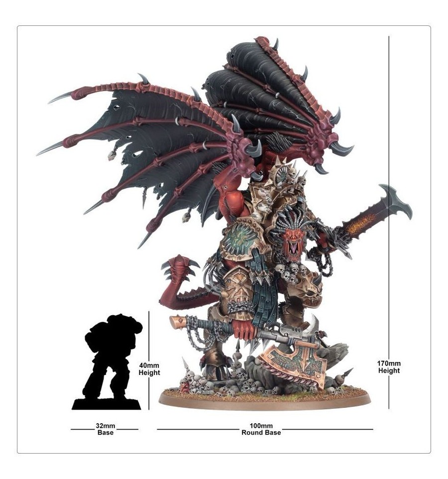 Angron es el Ángel Rojo, Señor de los Devoradores de Mundos, el Primarca Demonio de Khorne. Criado como esclavo en los brutales fosos de combate de Nuceria, este enloquecido semidiós buscó una muerte gloriosa en las batallas de la Herejía de Horus, solo para ser condenado a una eternidad de furia imperecedera. Durante diez mil años ha asolado el Imperio, con su furia inmortalizada, y los carniceros de la XII Legión han seguido su sangrienta estela. Al entrar en el espacio real, Angron es una imparable máquina de destrucción con la fuerza suficiente para destrozar bastiones con sus propias manos y detener a los Titanes en seco. Su sola presencia sume a quienes lo rodean en un frenesí de ira y miedo, mientras se abre paso entre ejércitos enteros en un torbellino de derramamiento de sangre apocalíptico.