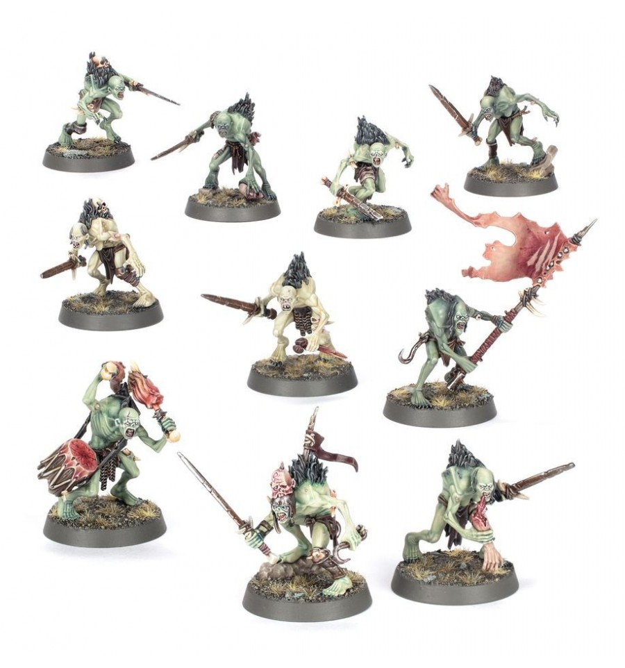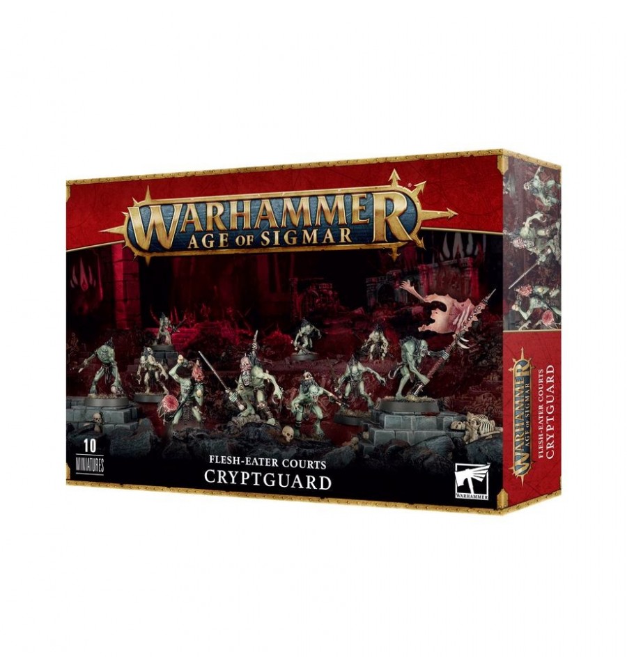 Este kit de plástico multicomponente construye 10 Cryptguard, criados necrófagos dedicados a la nobleza de las Cortes de los Flesh-eater. Los Cryptguard llevan una variedad de armas malditas a la batalla: puedes equipar a cada ghoul con una espada astillada y maltratada, o con una alabarda de mango largo y muy gastada. El kit también proporciona componentes para construir un músico baterista, un abanderado que ondea una bandera de piel desollada y un campeón Capitán de la Cripta con un tocado singularmente espeluznante.