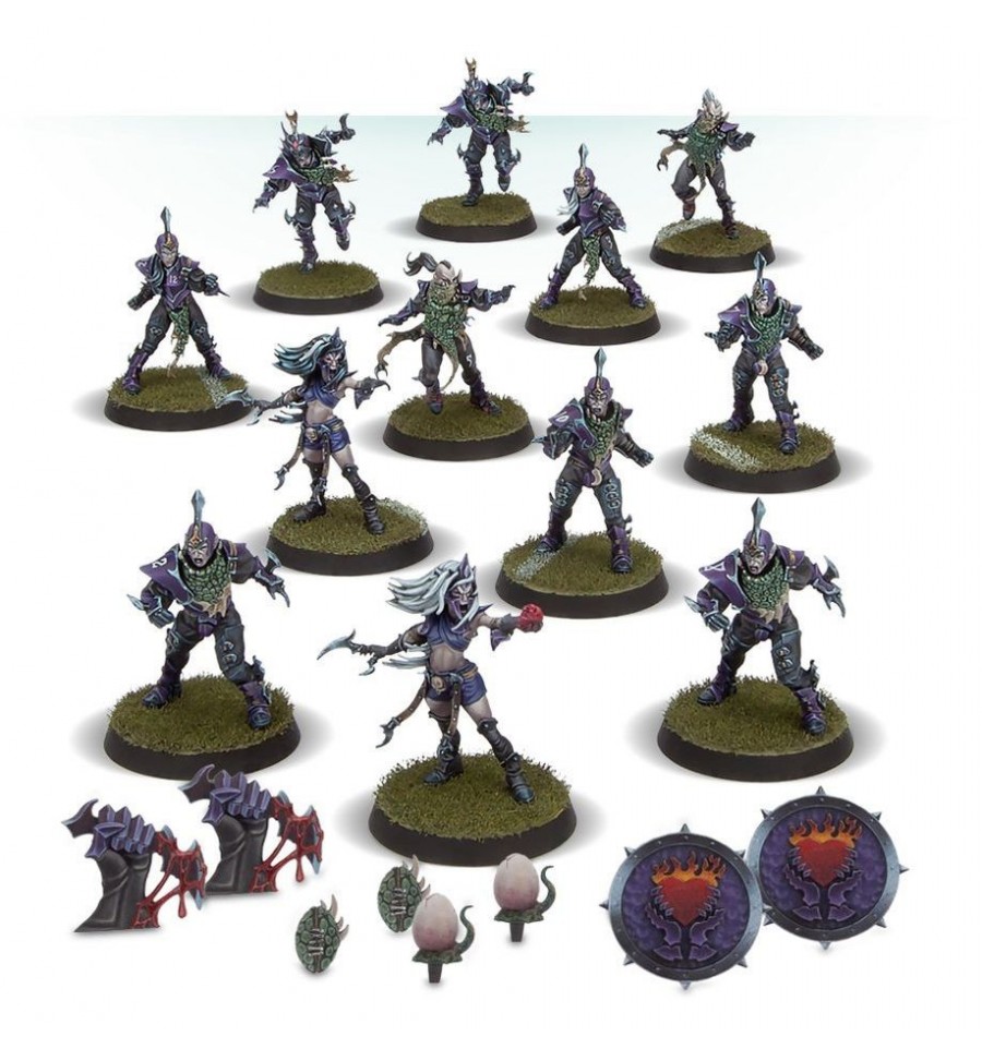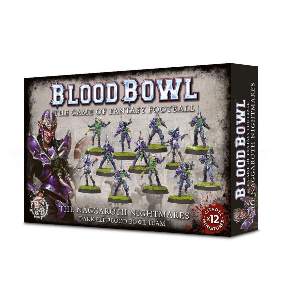 Este kit de plástico multicomponente contiene las piezas necesarias para montar a los Naggaroth Nightmares, un equipo de Blood Bowl de Dark Elves. El equipo consiste en 6 Linemen, 2 Blitzers, 2 Runner y 2 Witch Elves; todos van cubiertos de armadura con abundantes pinchos, con pieles de Cold Ones envueltas alrededor de los hombros. Las Witch Elves van... bastante menos protegidas en pos de ganar velocidad y agilidad, y tienen varias opciones de montaje con manos que señalan de forma desafiante a sus oponentes... o sujetando un corazón recién arrancado. Los Linemen disponen de 3 diseños de cabeza distintos.