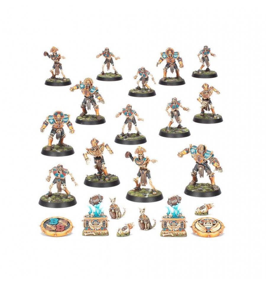 – 14 jugadores Tomb Kings de plástico color hueso: 2 Tomb Kings Blitzers, 2 Tomb Kings Throwers, 4 Tomb Guardians, 6 Skeleton Linemen, además de monedas, marcadores de segundas oportunidades y balones adicionales