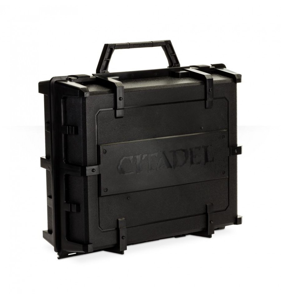 ¿Buscas una forma de almacenar y transportar de manera segura tus pinturas, pinceles y herramientas Citadel? No busques más y mira lo que te ofrecemos: Esta caja de plástico resistente incluye 2 bandejas con capacidad para 21 botes de pinturas Citadel, y con espacio para otros 28 en la parte inferior. Encaja perfectamente en uno de nuestros maletines para miniaturas y, cuando no la transportes, estas cajas se apilan, ¡lo que hace de ellas una solución de almacenamiento ideal para las mayores colecciones de pintura!