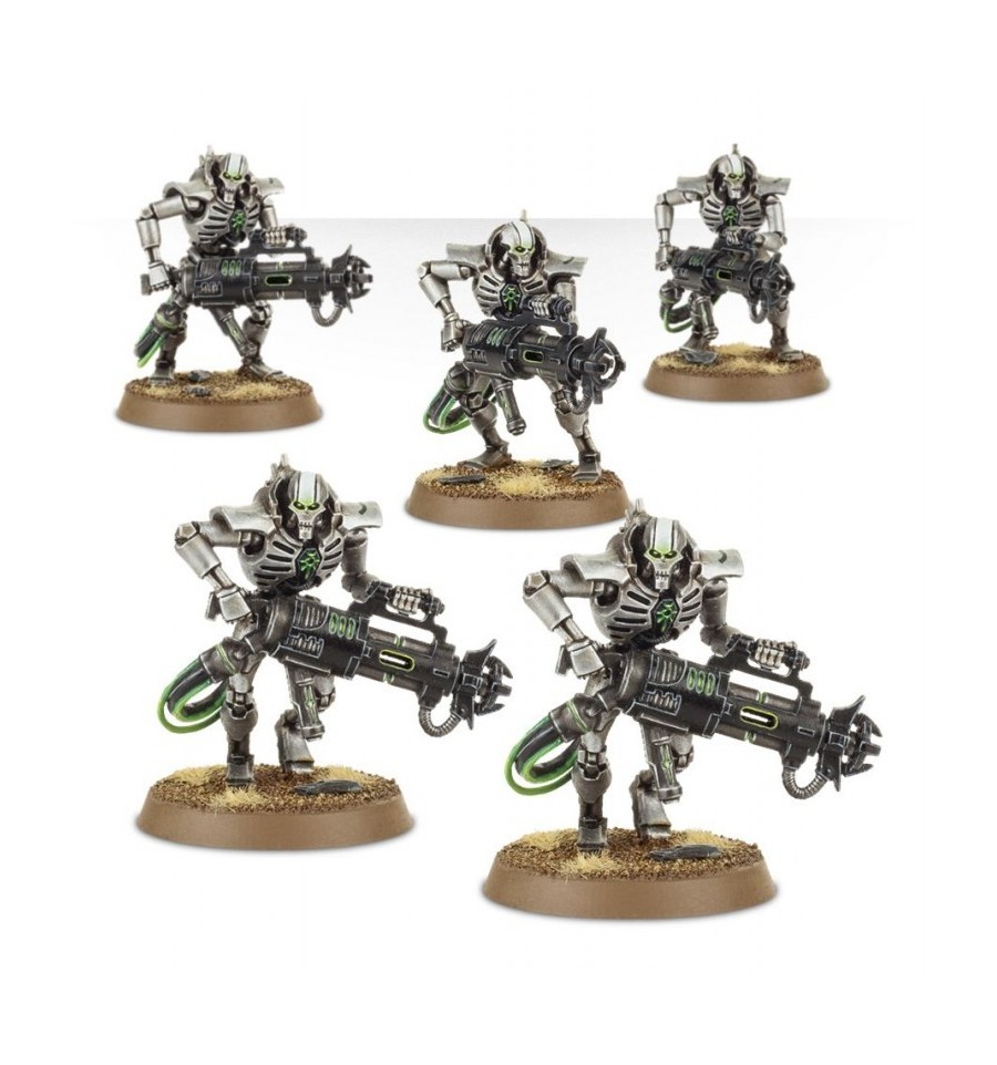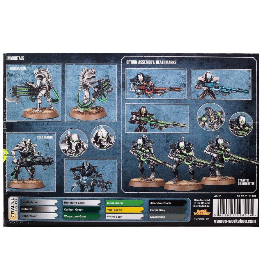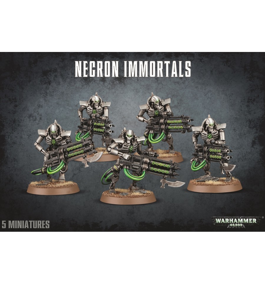 Los Necron Immortals poseen la clásica cara de esqueleto metálico tan espeluznante y típica de su raza. Sus largas extremidades tienen pernos en las articulaciones, su cuerpo tiene un aspecto encorvado y su cabeza y hombros van protegidos por un collarín blindado. Lucen sutiles iconos Necrons en el esternón. Puedes equipar a tus Immortals con los devastadores blásteres gauss o con carabinas tesla.