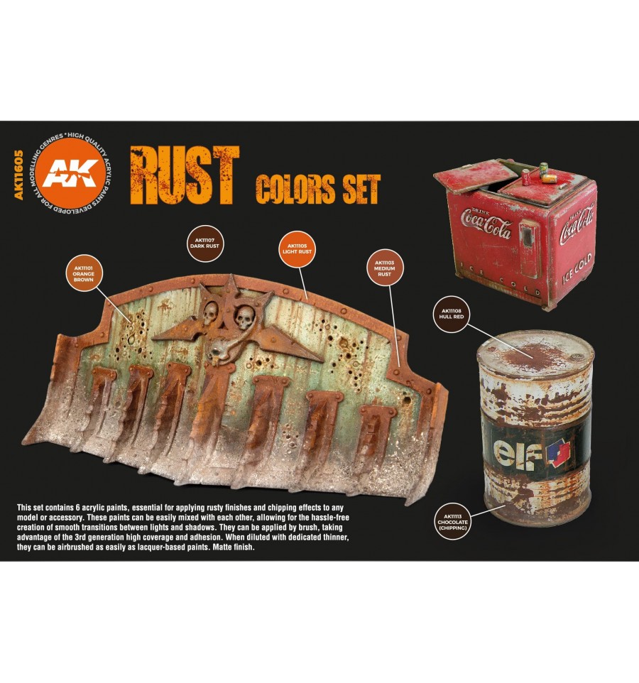 Este set contiene 6 pinturas acrílicas, esenciales para aplicar acabados oxidados y efectos de astillado a cualquier modelo o accesorio. Estas pinturas se pueden mezclar fácilmente entre sí, lo que permite la creación sin problemas de transiciones suaves entre luces y sombras. Se pueden aplicar con brocha, aprovechando la alta cobertura y adhesión de tercera generación. Diluidas se pueden pintar con aerógrafo tan fácilmente como las pinturas a base de laca. Acabado mate.