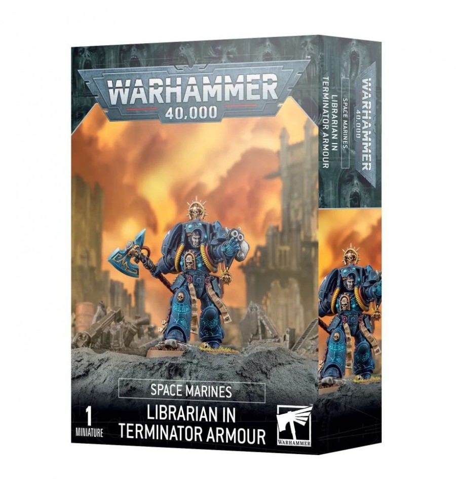 Este kit de plástico multicomponente construye un Librarian con Terminator Armor, una potencia psíquica de su Capítulo. Empuña un arma de fuerza, un foco destructivo para sus energías mentales, en forma de un hacha adornada, mientras que un bólter de tormenta montado en la muñeca escupe proyectiles a su enemigo. La imponente armadura del bibliotecario está decorada con el símbolo del cráneo con cuernos del Librarius, presenta sigilos de protección grabados directamente en la ceramita e incorpora una capucha psíquica que lo ayuda a resistir la brujería enemiga.