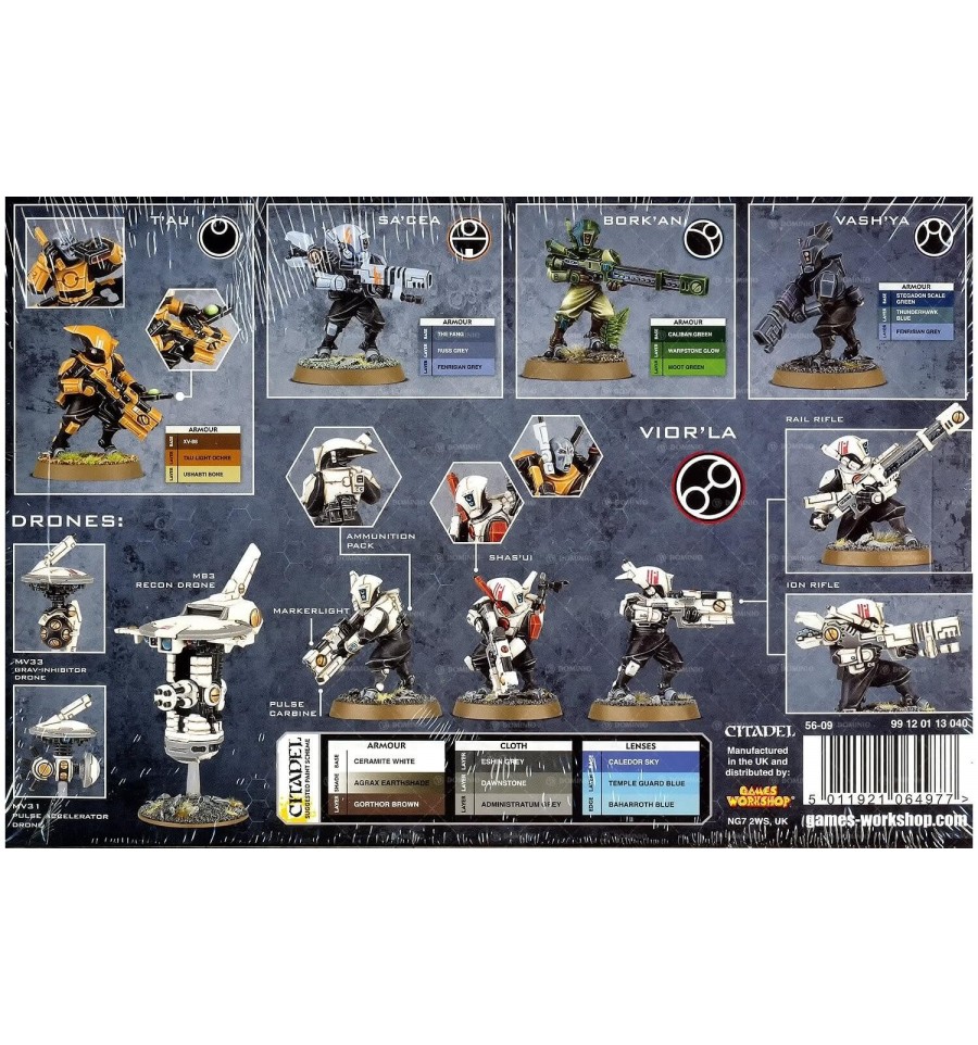 Esta caja multicomponente de plástico contiene 137 componentes con los que montar 10 Pathfinder T'au, un Pulse Accelerator Drone, un Grav-inhivitor Drone y un Recon Drone.