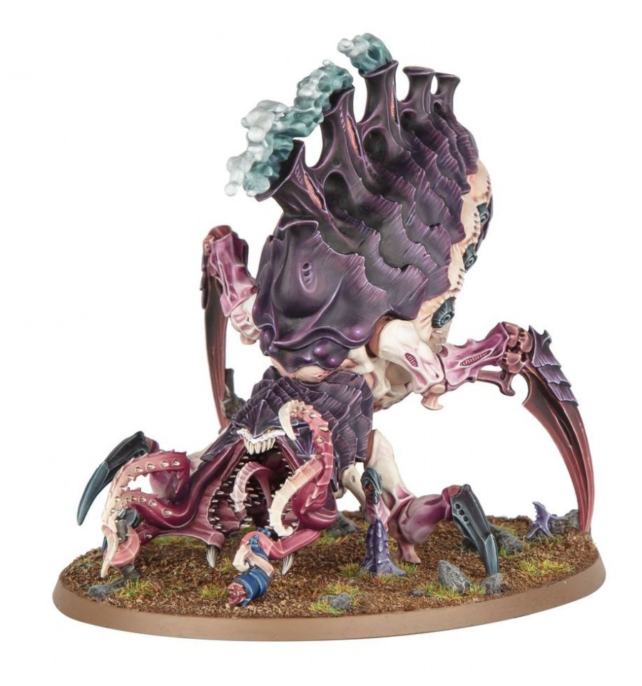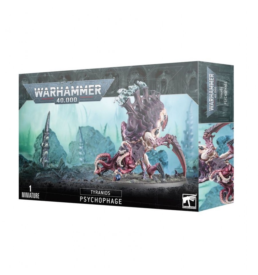 Este kit de plástico multicomponente construye un psicófago, una monstruosidad tiránida impulsada por un hambre psíquica frenética. Las fauces abiertas y de múltiples mandíbulas de esta vil criatura están revestidas de dientes afilados y tentáculos con púas, lo que le permite atrapar, desmenuzar y tragar a su presa. Elevado sobre seis extremidades con puntas de garras, su cuerpo bulboso sobresale de sacos y orificios digestivos, y está rematado con chimeneas dorsales que escupen esporas.