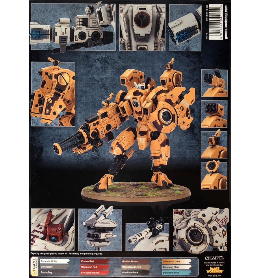 El XV104 Riptide lleva la evolución del traje de batalla T'au a un nivel completamente nuevo. En primer lugar, el modelo es enorme, y se eleva por encima del resto de los T'au, incluso de otros trajes de batalla y tanques. Los elegantes paneles de armadura, junto con los pernos y las rejillas, cubren su cuerpo. A pesar de su enorme tamaño, con articulaciones esféricas, sigue siendo un modelo maniobrable cuyos brazos y piernas se pueden colocar de varias formas diferentes. Ya sea de pie o incluso de rodillas, puedes usarlo como una pieza central única y dinámica para tu ejército T'au. Además de tres cabezas variantes, viene con una variedad de opciones de armas que incluyen un cañón de ráfaga pesado, sistemas de misiles inteligentes vinculados, un bláster de fusión y un generador de escudo Riptide. Si eso no fuera suficiente, el kit también viene con dos drones con misiles blindados.