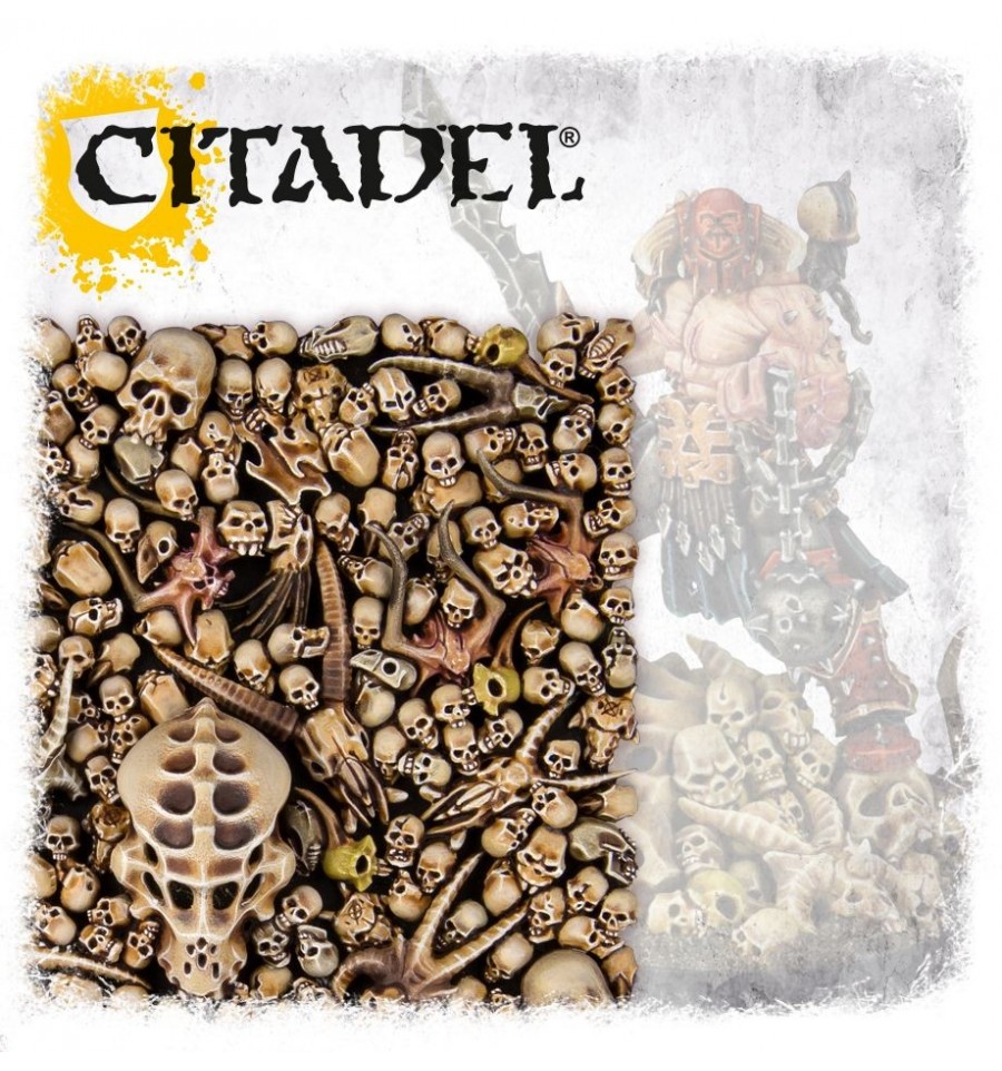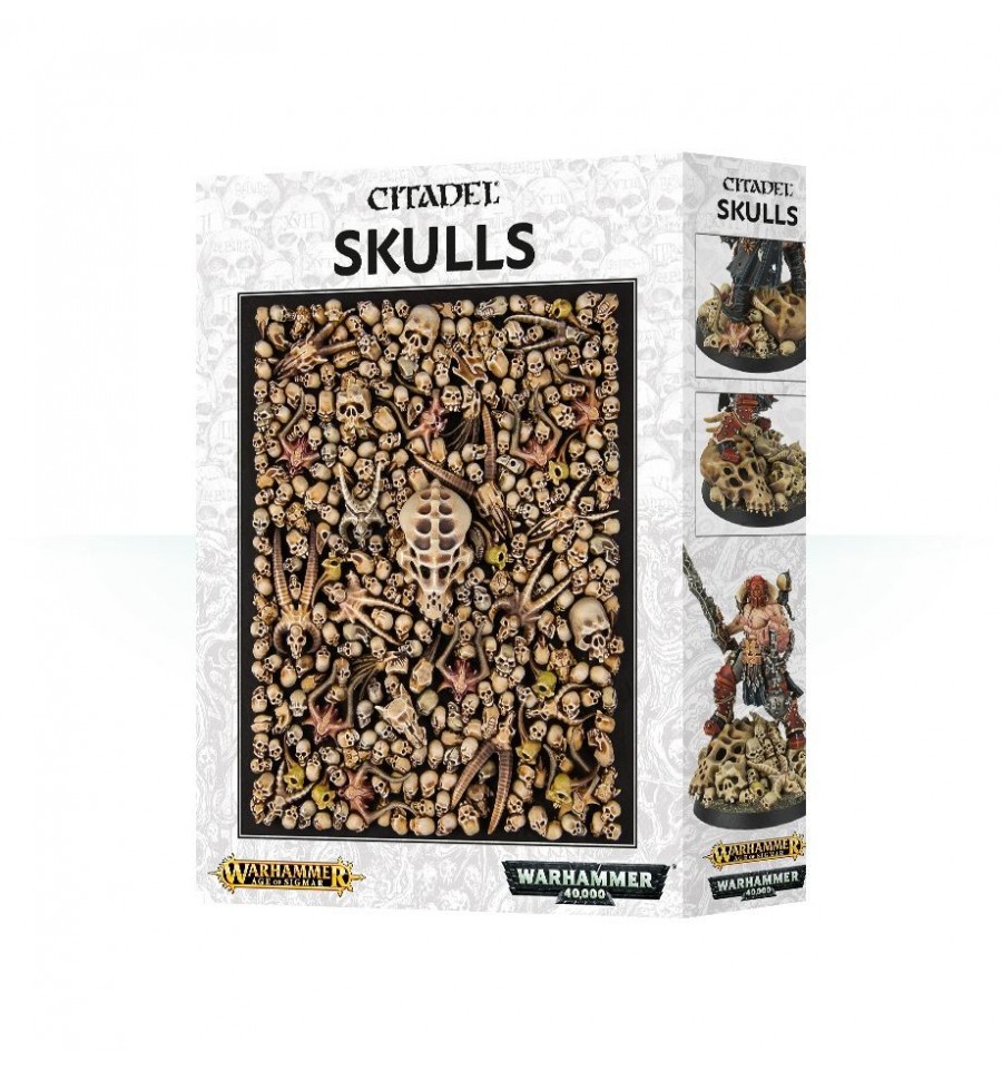 Por eso os presentamos con orgullo Citadel Skulls. No es otra cosa que una caja de 340 cráneos (en efecto, trecientos cuarenta con todas sus letras) fabricados en plástico para que podáis decorar escenografía, peanas y miniaturas como os apetezca. Y, para quién se quede corto, hemos incluído 20 mandíbulas extra.
