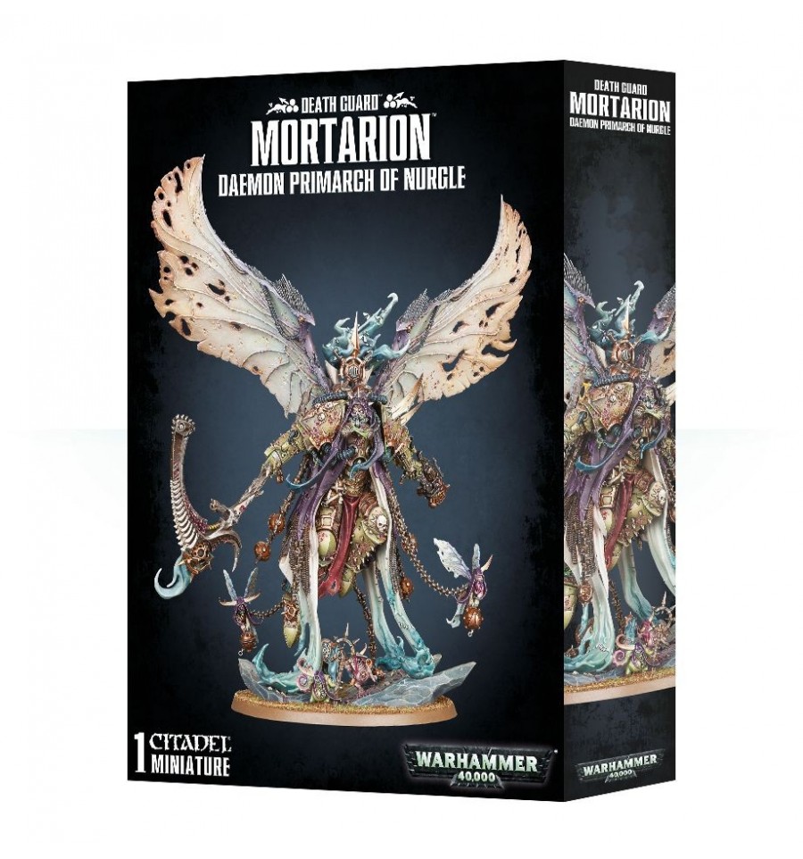 Durante diez mil años, Mortarion, Señor de la Guardia de la Muerte, ha aplastado a sus enemigos en el campo de batalla. Rodeado por los ácaros de Daemon, las moscas zumbidoras y los nocivos vapores de la peste, Mortarion se lanza a la batalla en enormes y crujientes alas. El ruido sordo de estos piñones asquerosos llena al enemigo con un miedo reptante, incluso mientras arrastran el hedor de la muerte a través de sus líneas. Incluso pararse en presencia del Señor de la Muerte es letal, los oponentes se ahogan y colapsan mientras sucumben a las innumerables plagas que agitan el aire a su alrededor.