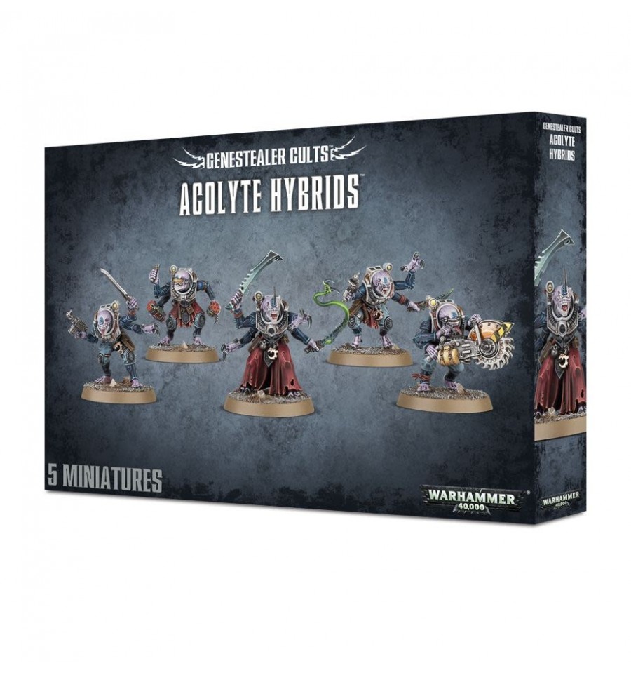Bañándose en la extraña gloria del patrón que les infectó, los Acolyte Hybrids sisean en la oscuridad. Cuando llega el momento de deshacerse de los ropajes raídos que usan como disfraz de su fealdad, los Acolyte Hybrids se arrastran hasta la superficie y la luz, con sus rostros grotescos deformados en alegría subhumana. Muestran una mezcla extraña de las especies de las que provienen: la velocidad de un Purestrain Genestealer mezclada con la astucia humana es una combinación potente. Estos híbridos disparan ráfagas de pistola automática antes de caer sobre sus enemigos en un derroche de garras, armas de combate cuerpo a cuerpo y gritos de alabanza a sus amos.