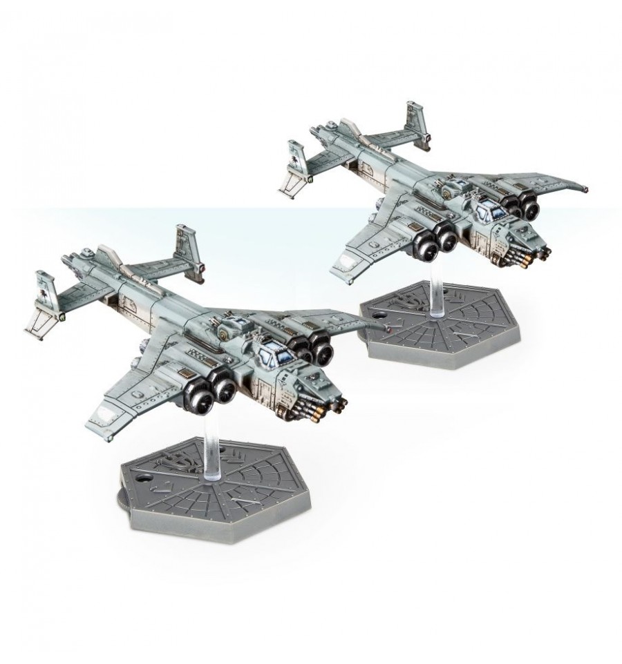 2x peanas de Aeronautica Imperialis (cada peana indica los arcos delantero, trasero y laterales de la miniatura, así como los diales de velocidad y altitud. Cada peana también incluye un soporte transparente para conectar el avión a la peana).