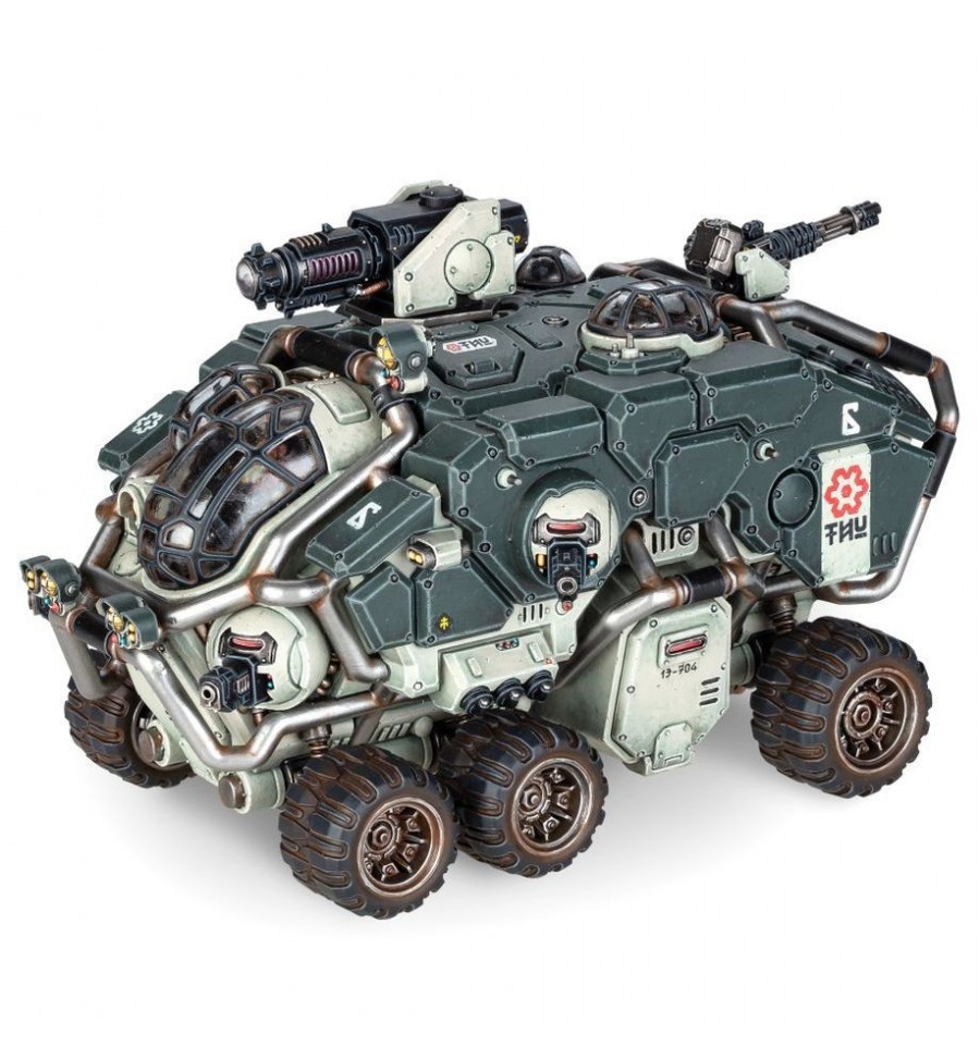 Este kit de plástico multicomponente construye una Fortaleza Terrestre Hekaton, un transporte pesado indomable cargado con poderosas armas. Este poderoso vehículo de seis ruedas se puede construir con una de las tres poderosas armas de torreta ajustables: un cañón de iones cíclicos para derribar a la infantería más pesada, un haz de conversión pesado SP para abrir una franja a través de cualquier objetivo o un cañón pesado de magna-riel. que puede reducir a escoria incluso los tanques más resistentes. Este arma principal está reforzada por dos pares de armas patrocinadoras de torreta de bolas ajustables, ya sean cañones de cerrojo o rayos de iones.