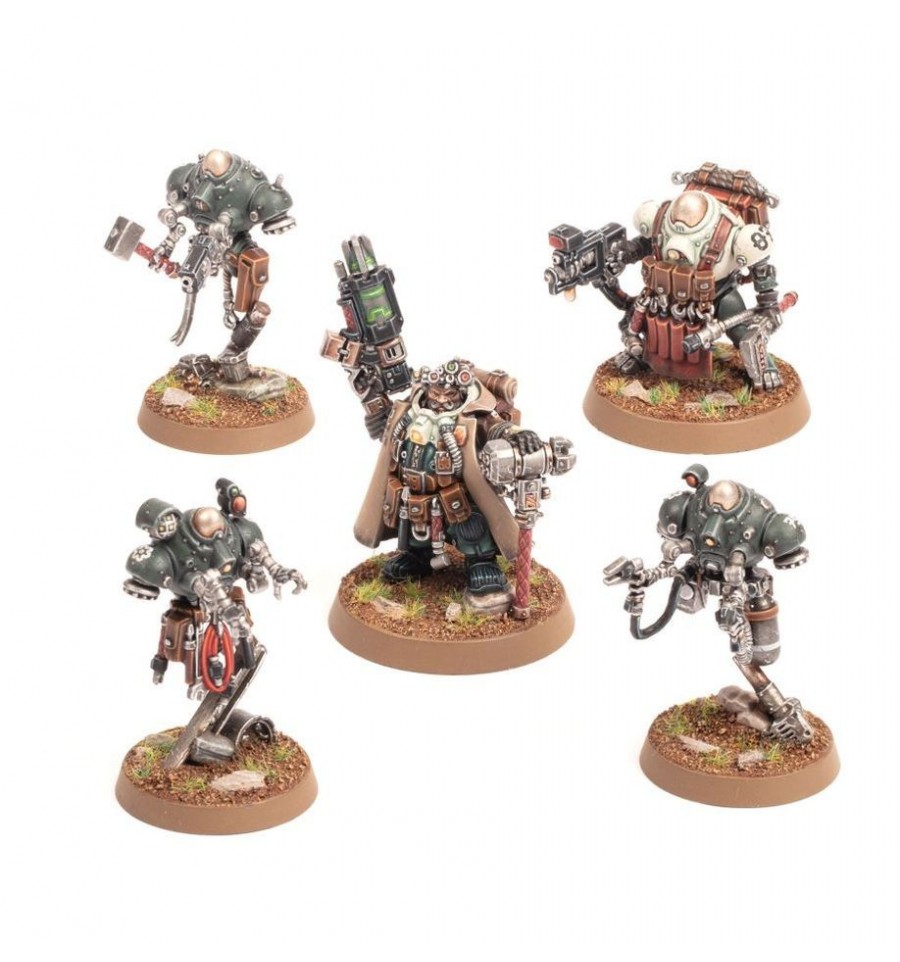 Este kit de plástico multicomponente construye un Brôkhyr Iron-master, un ingeniero de campo de alto rango con un séquito que lo acompaña. Armado con un rifle de gravitón y un martillo de gravitón de su propia creación, la habilidad tecnológica del Maestro de Hierro se muestra en las numerosas herramientas colgadas de su traje vacío, una panoplia repartida entre sus cuatro ayudantes. Un asistente Ironkin confiable lleva una gran cantidad de hardware adicional, incluido un cortador de rayo láser y tres E-COG flotando con herramientas especializadas: una antorcha de plasma, brazos manipuladores y una pistola bólter con patrón Autoch, respectivamente. El kit incluye una visera multiespectral para Iron-master, que se puede usar sobre los ojos o empujar hacia arriba sobre la frente.